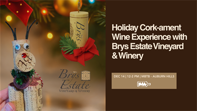 Holiday Cork-ament Wine Experience! Choose from 3 Brys wines, enjoy a generous charcuterie cup, and make 2 festive cork ornaments to take home. Plus, 20% off Brys Estate featured wines! $45 | Dec. 14 | 12–2 PM | MBTB Auburn Hills.